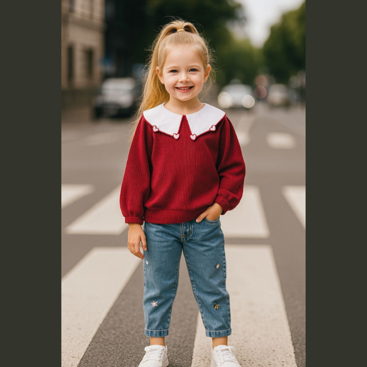 امنحي أميرتك الصغيرة إطلالة ساحرة وعملية مع هذا الطقم المكون من قطعتين. يتميز بكنزة محبوكة ناعمة مع ياقة بيضاء كبيرة مزينة بقلوب رقيقة، وبنطلون جينز مريح مزين بتطريزات جميلة. تصميم أنيق ومثالي للارتداء اليومي والمناسبات الخاصة. متوفر للفتيات من عمر 2 إلى 10 سنوات
