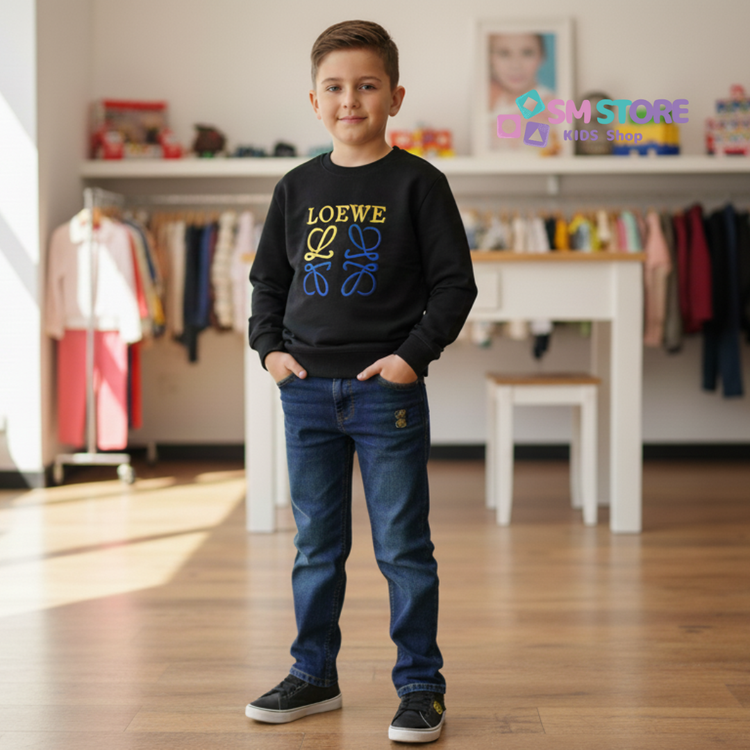 Laissez votre enfant rayonner avec ce sweat-shirt en molleton de coton doux et respirant**, d'un noir profond et élégant ⚫. Il arbore un design unique et audacieux avec le nom "LOEWE" écrit en un éclatant jaune soleil 💛 et des motifs stylisés en bleu électrique 💙. Ces couleurs vives et tendances apporteront une touche de gaieté et d'originalité à la garde-robe de votre enfant. Le tissu, incroyablement doux au toucher, respecte la peau délicate de votre petit trésor et lui offre une liberté de mouvement totale pour toutes ses explorations.