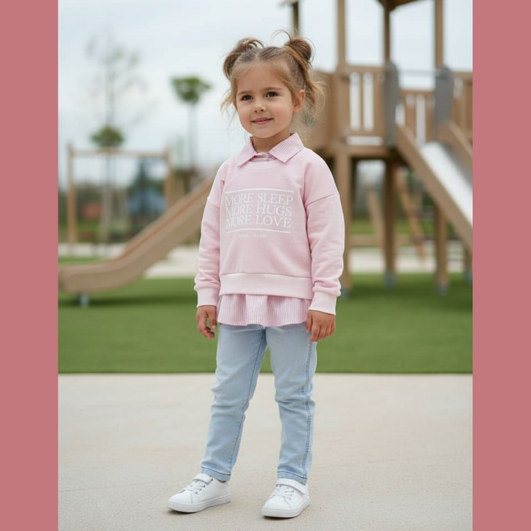 بنطلون جينز مريح:** بنطلون جينز باللون الأزرق الفاتح 👖، بتصميم عصري يسمح بحرية الحركة ويوفر الراحة لطفلتكِ طوال اليوم