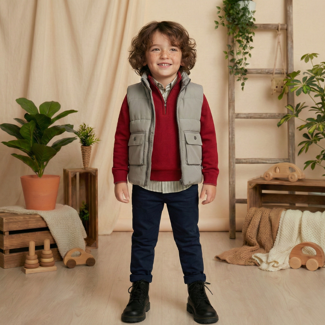 🎨 Option 2: Un gilet gris clair moderne, un pull rouge vibrant, une chemise vert clair à rayures et un pantalon bleu marine résistant.