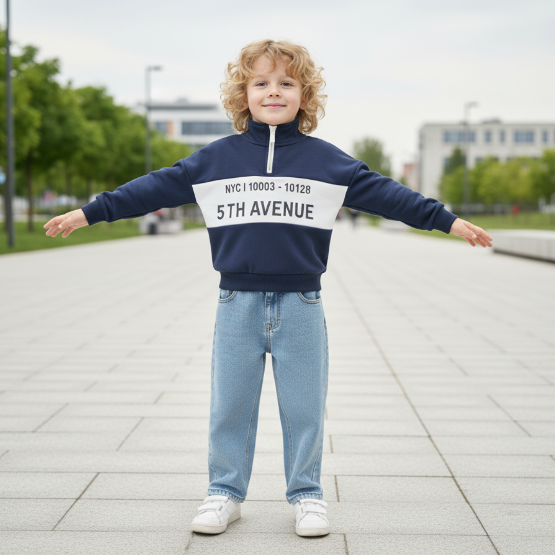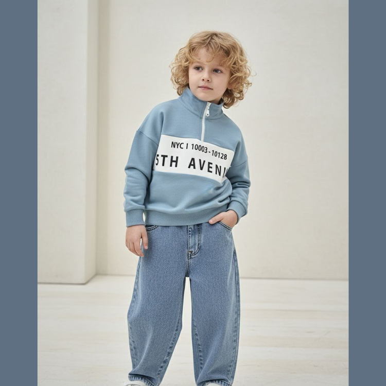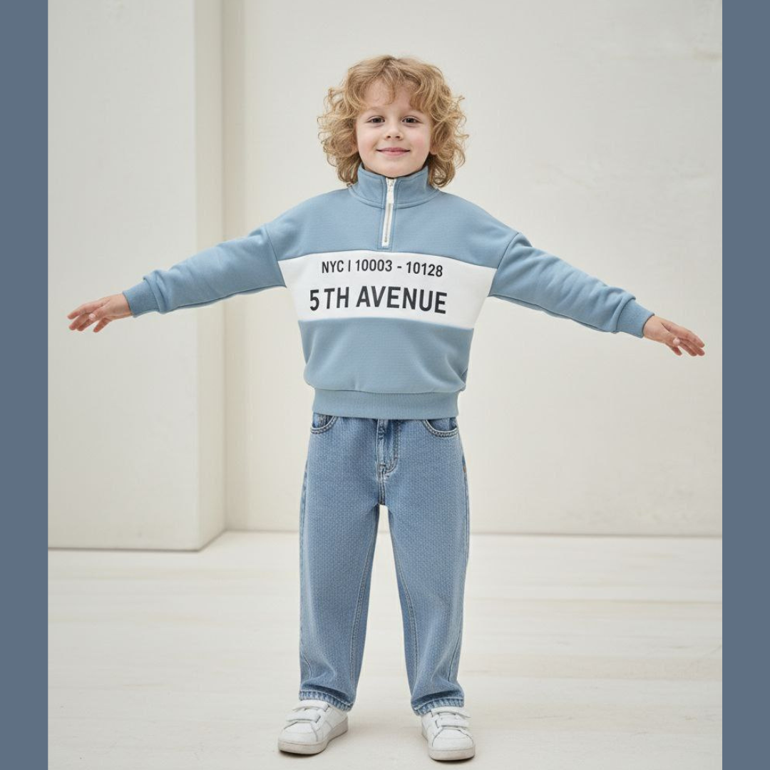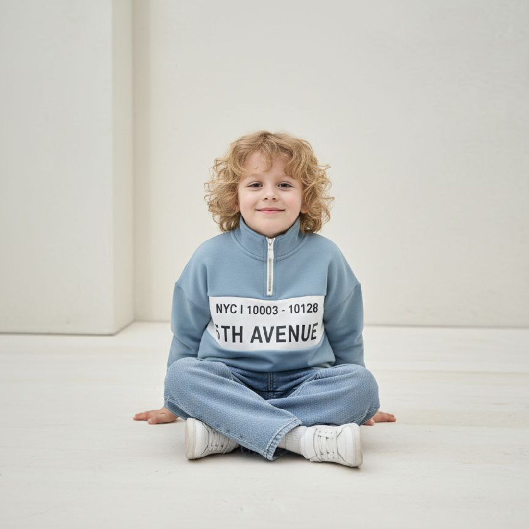 البلوفر الأنيق: بلوفر عصري بقصة مريحة ولون أزرق سماوي راقٍ، يزينه شريط أفقي عريض باللون الأبيض يبرز العبارة المميزة المستوحاة من شوارع الموضة الأمريكية. 🏙️ يتميز بياقة مرتفعة وسحاب أمامي، مما يجعله سهل الارتداء والخلع ويوفر دفئًا إضافيًا. صُنع من خامة القطن الناعمة والمبطنة عالية الجودة، التي تضمن لطفلك الدفء والراحة القصوى خلال اللعب والاستكشاف