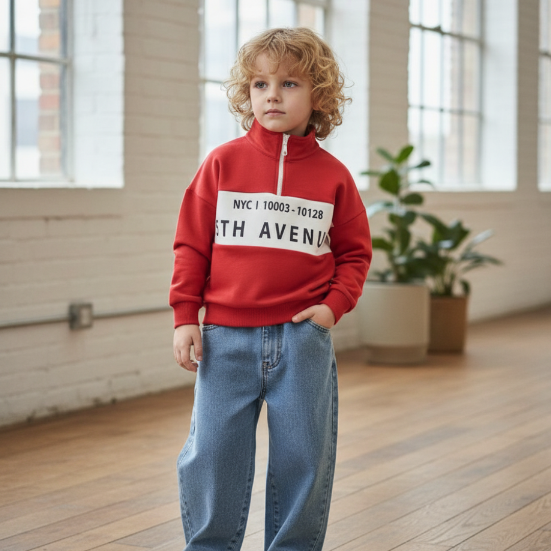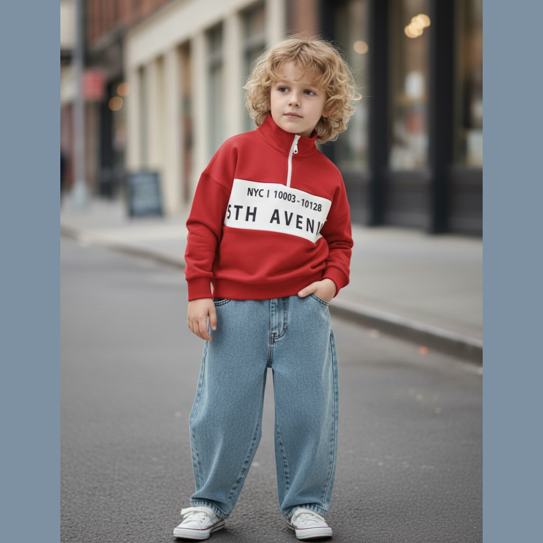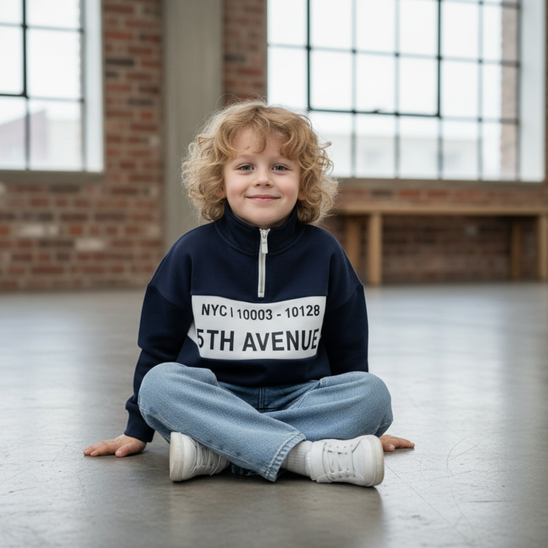 البلوفر الأنيق: بلوفر عصري بقصة مريحة ولون أزرق سماوي راقٍ، يزينه شريط أفقي عريض باللون الأبيض يبرز العبارة المميزة المستوحاة من شوارع الموضة الأمريكية. 🏙️ يتميز بياقة مرتفعة وسحاب أمامي، مما يجعله سهل الارتداء والخلع ويوفر دفئًا إضافيًا. صُنع من خامة القطن الناعمة والمبطنة عالية الجودة، التي تضمن لطفلك الدفء والراحة القصوى خلال اللعب والاستكشاف