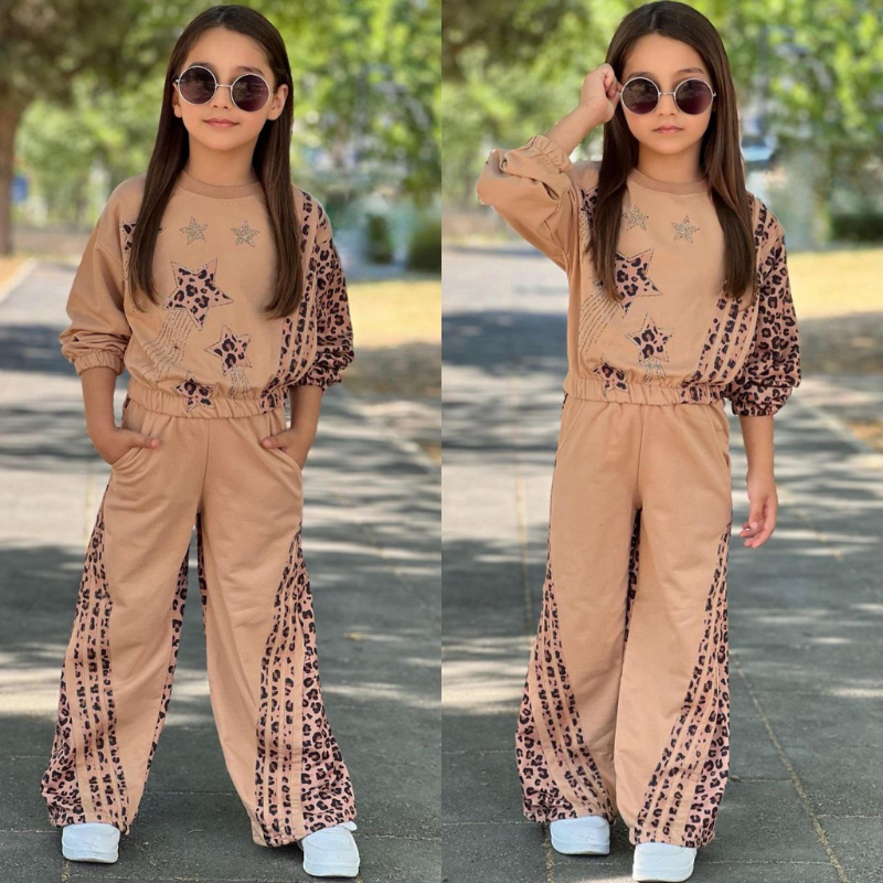 لإطلالة جريئة وعصرية لا مثيل لها، نقدم لأميرتك هذا الطقم المذهل المكون من قطعتين. يجمع التصميم بين أقوى صيحات الموضة، حيث يتميز التوب بأكمام واسعة بطبعة النمر وصدر مزين بنجوم لامعة تضيف لمسة من التألق. يكتمل الطقم بسروال مريح بقصة أرجل واسعة مع نفس طبعة النمر الجذابة على الجانبين. مثالي للفتيات اللواتي يعشقن التميز والموضة