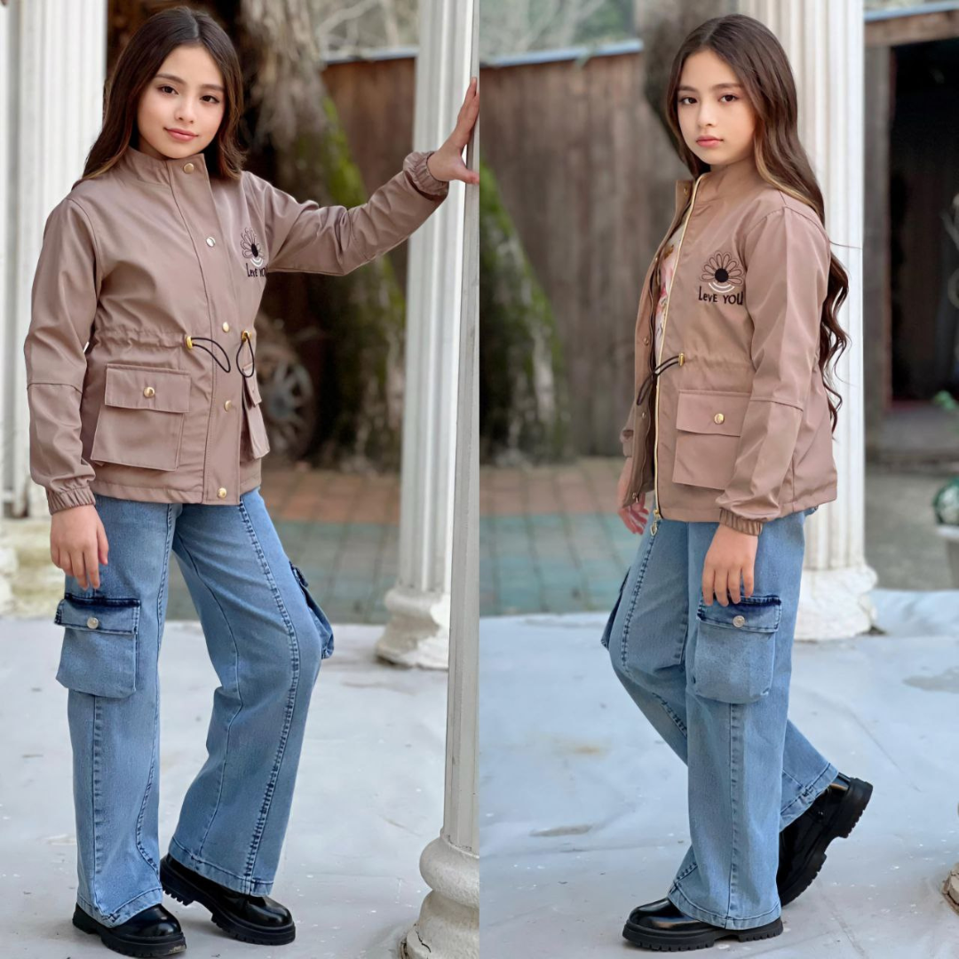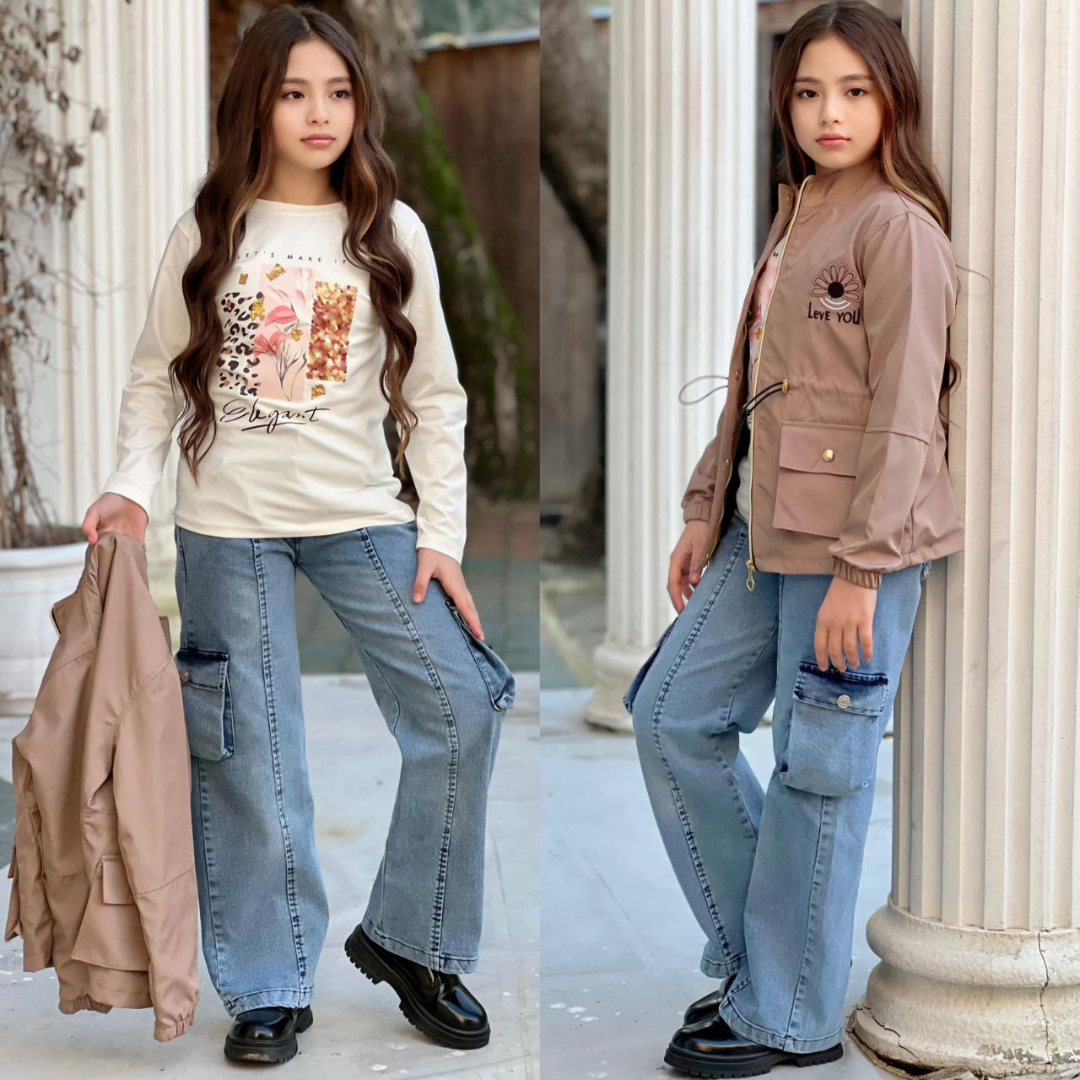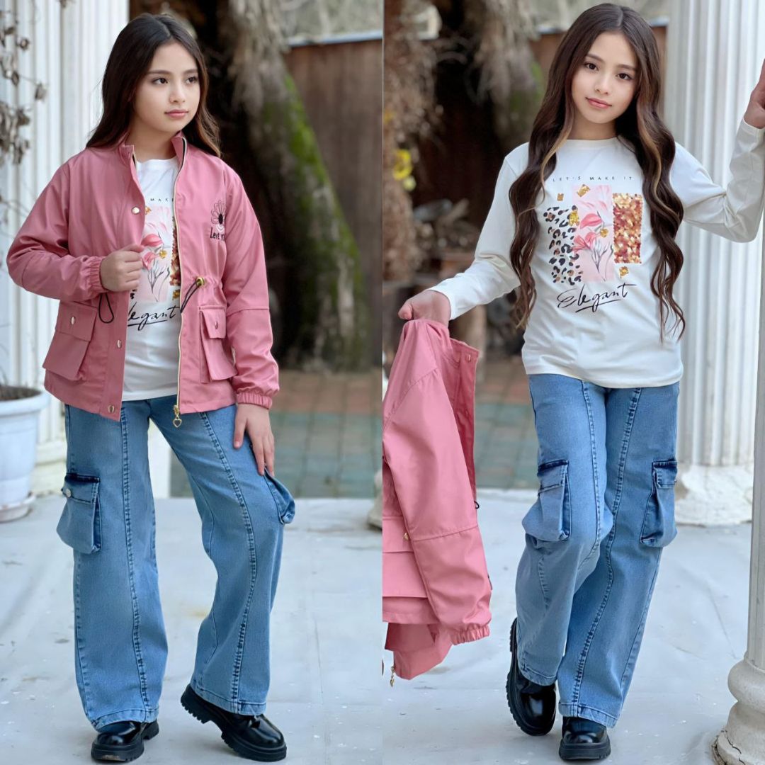 طقم بناتي عصري وأنيق مكون من ثلاث قطع، مناسب للفتيات من عمر 3 إلى 12 سنة. يتكون الطقم من