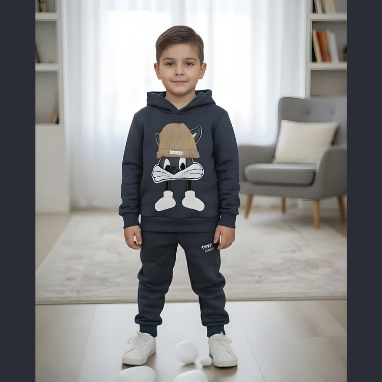هودي (كنزة بقبعة): يتميز بتصميم عصري مزين بطبعة شخصية كرتونية لطيفة ترتدي قبعة صوفية مميزة 🧢. الهودي متوفر بثلاثة ألوان جذابة مستوحاة من الصور: الأخضر الداكن 💚، الرمادي الأنيق 🩶، والأزرق الداكن 💙