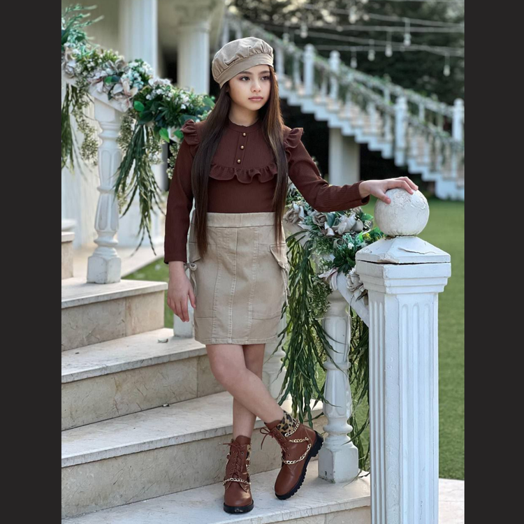 بلوزة بكشكشة رقيقة: تتميز هذه البلوزة بلون بني شوكولاتة دافئ، مع تصميم أنيق مزين بكشكشة رقيقة على الأكتاف والصدر، مما يضفي لمسة رقيقة ومميزة على إطلالة أميرتكِ. تتميز البلوزة بتصميم عصري وأنيق، مع أزرار أمامية للإغلاق
