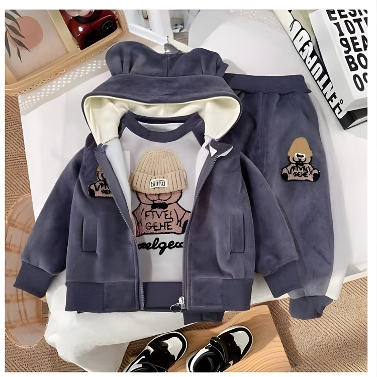 مرحباً بكم في عالم الأناقة والراحة لطفلكم! 🌟 **طقم المخمل الكاجوال للأطفال 🐻 امنح طفلك إطلالة دافئة ومميزة مع هذا الطقم الكاجوال المكون من ثلاث قطع. مصمم بعناية فائقة ليوفر لطفلك أقصى درجات الراحة والأناقة في آن واحد.