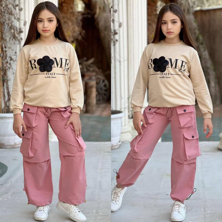 أحدث صيحات الموضة لإطلالة عصرية ومريحة! طقم من قطعتين يجمع بين سويت شيرت أنيق مزين بكلمة روم مع وردة بارزة ثلاثية الأبعاد، وبنطلون كارغو عملي بجيوب متعددة وأساور قابلة للتعديل لمظهر جريء ومميز