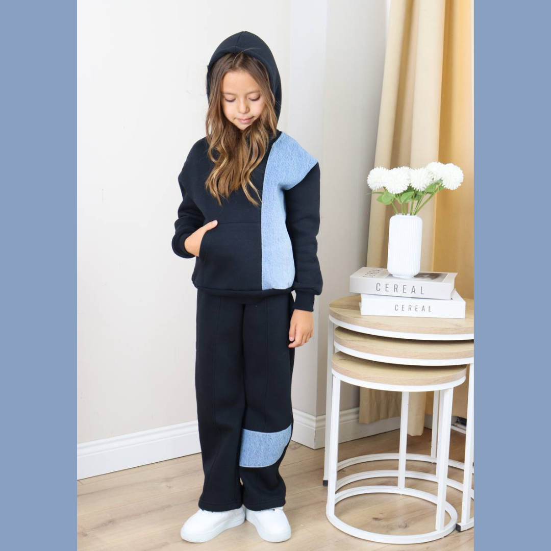 * **Le Pantalon Confortable** : Assorti au sweat, ce pantalon noir est également doté d'un empiècement bleu clair effet jean sur le bas d'une jambe, créant une harmonie visuelle parfaite. Sa coupe ample assure une liberté de mouvement optimale pour jouer et se détendre. 🤸♀️