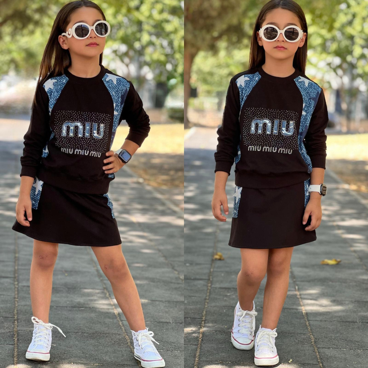 Le haut se compose d'un sweatshirt à manches longues, orné du célèbre logo "miu miu" scintillants ✨ sur le devant. La jupe assortie, à la coupe moderne, complète parfaitement le look. Les deux pièces sont sublimées par des empiècements décoratifs au motif étoile et effet jean 👖 sur les épaules et les côtés, ajoutant une touche d'originalité.
