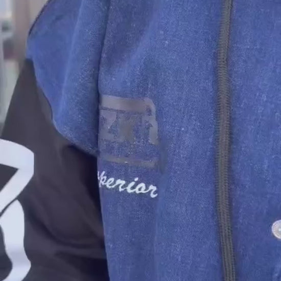 بنطال جينز مريح: بنطال جينز باللون الأزرق الداكن يتناسق تماماً مع الجاكيت، مصمم ليوفر راحة تامة وحرية في الحركة، مما يجعله مثالياً للعب والأنشطة اليومية
