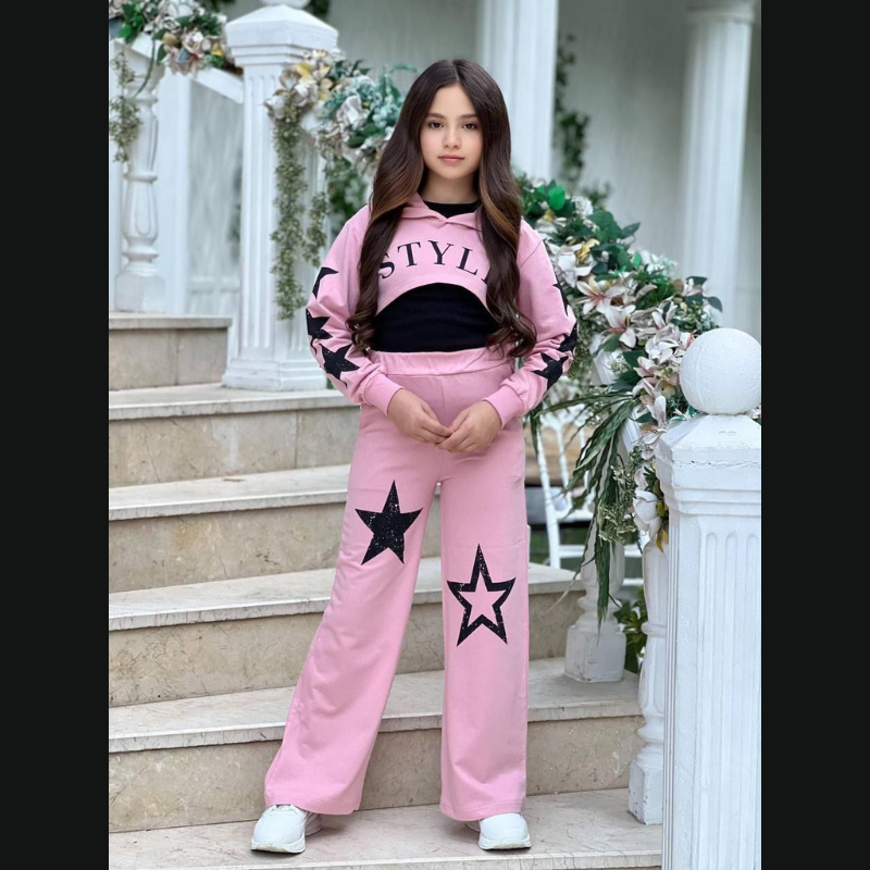 امنحي ابنتك إطلالة عصرية وجريئة مع هذا الطقم المذهل المكون من 3 قطع. يجمع التصميم بين الراحة والأناقة، ويتكون من توب داخلي، هودي قصير مزين بطبعة ونجوم سوداء على الأكمام، مع سروال واسع بنفس تصميم النجوم الجذاب. إنه الخيار المثالي للفتيات اللواتي يعشقن الموضة ويرغبن في التعبير عن أسلوبهن الخاص بكل ثقة