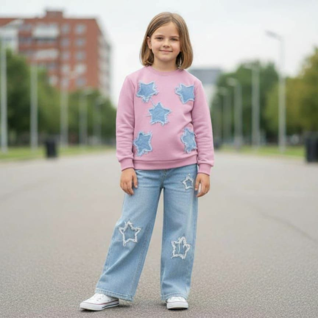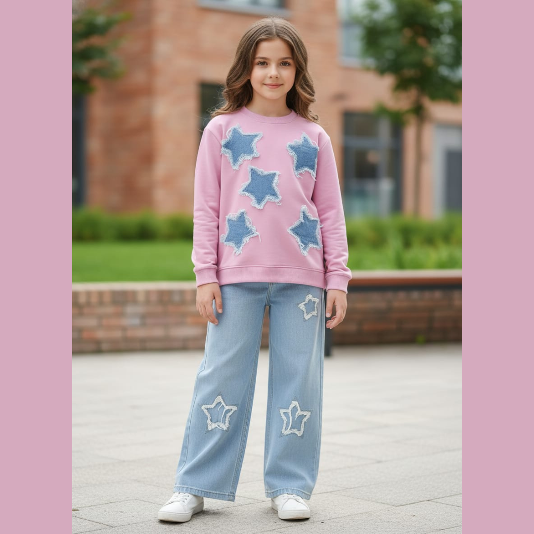 القطعة السفلية: بنطال جينز واسع وعصري باللون الأزرق الجينز الفاتح، ينساب بخفة ليمنح طفلتكم أقصى درجات الحرية في الحركة. يتميز البنطال بتطريزات نجمية بيضاء ناعمة على الأطراف، تتناغم بشكل مثالي مع نجوم السويت شيرت، لإطلالة متكاملة وجذابة. خامة الجينز القطني الخفيف تضمن المتانة والراحة، وتتحمل اللعب المتكرر والغسيل المستمر، ليبقى الطقم جديداً ومشرقاً. 👖✨