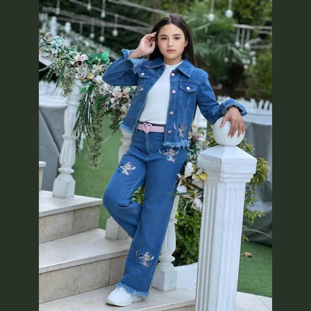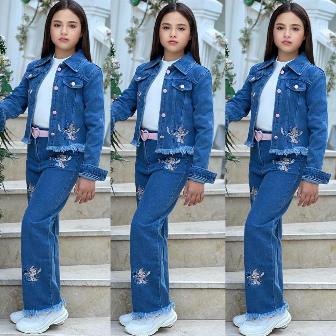بنطلون جينز مريح بنفس اللون الأزرق الرائع، يكمل مظهر الجاكيت بتطريزات "ستيتش" المرحة وتفاصيل الحواف المنسلة عند الأطراف، مما يوفر راحة وأناقة معاً