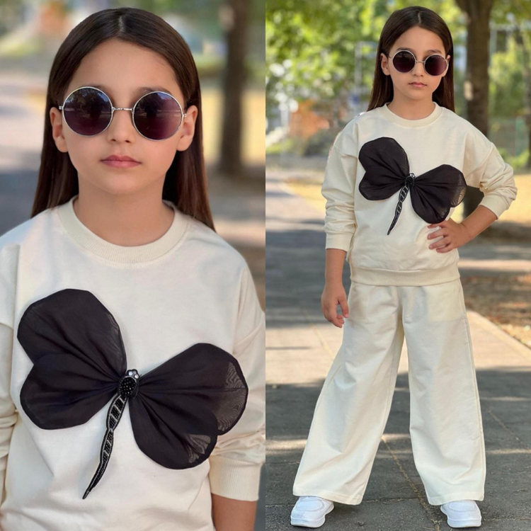 يتميز السويت شيرت بتصميمه البسيط والراقي، وتزينه فراشة كبيرة بارزة (ثلاثية الأبعاد) في المنتصف، تضفي لمسة من الحيوية والجمال. يأتي الطقم مع بنطال واسع الأرجل يواكب أحدث صيحات الموضة، ويمنح طفلتك حرية كاملة في الحركة واللعب