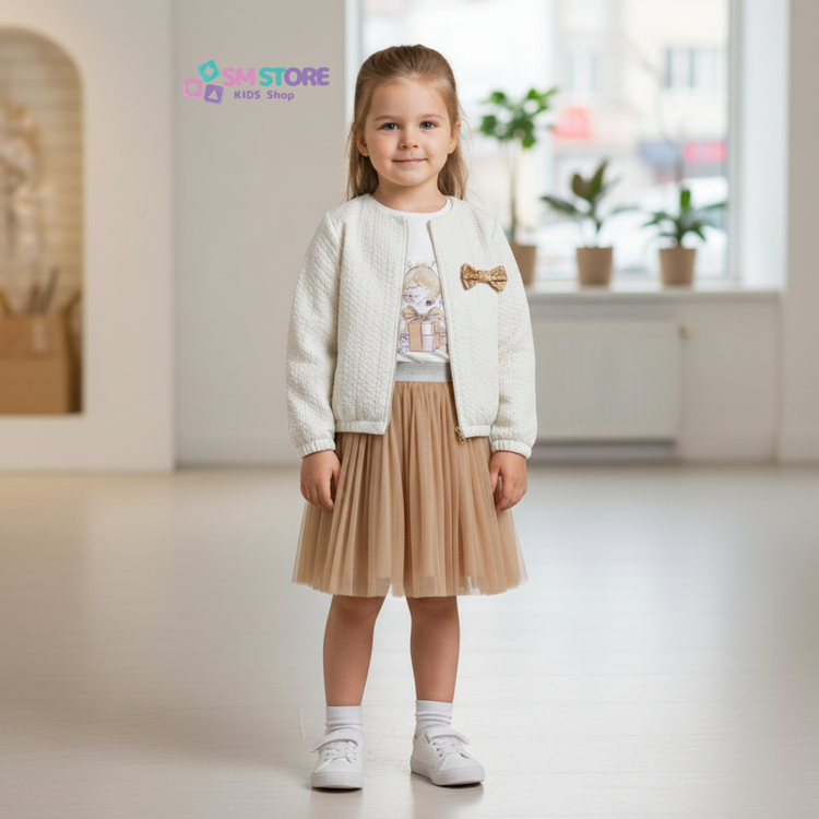 يتضمن الطقم جاكيتًا أنيقًا مصنوعًا من نسيج محبوك عالي الجودة، يضمن الدفء والراحة مع لمسة فاخرة، ويزينه فيونكة ذهبية لامعة تضيف بريقًا خاصًا. ✨